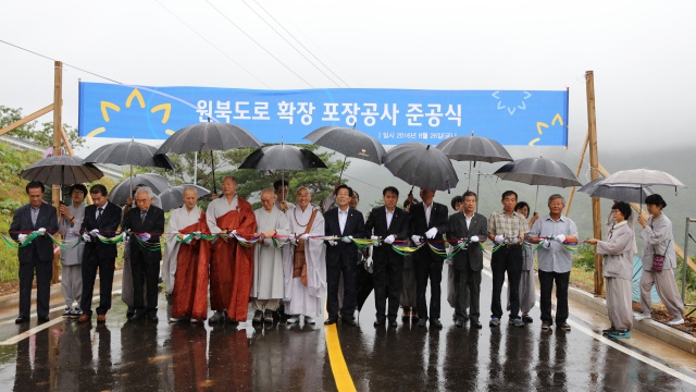 그동안 문경 정토수련원에 오기 위해서는 아주 가파르고 좁은 비탈길을 힘들게 올라왔어야 했는데, 이번에 경상북도와 문경시의 지원으로 2차선 아스팔트 도로가 깨끗하게 놓여지면서 많은 분들이 수련을 하러 찾아오기가 더 편리해졌습니다.