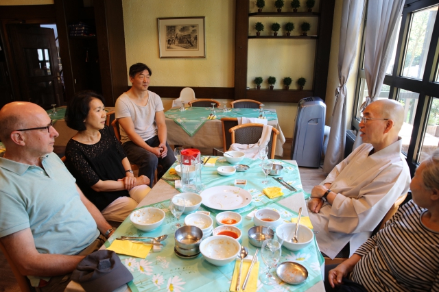 점심 식사는 프랑크푸르트에서 식당을 운영하고 있는 이종서님의 초대로 이뤄졌습니다. 이종서님은 저가항공을 타고 다니며 세계 곳곳에서 교민들의 어려움을 들어주는 스님에게 감동한 이후 스님이 프랑크푸르트에 올 때마다 가장 먼저 나서서 식사 접대를 자청하는 분입니다. 스님은 감사히 식사 접대를 받고 새책 ‘날마다 새날’을 사인해서 선물했습니다.