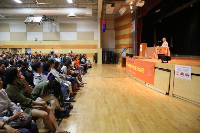 저녁 6시, 스님이 강연장 안으로 들어서자 토론토 한인회관을 가득 메운 500여 명의 대중들은 열렬한 환호와 박수갈채를 보냈습니다. 해외 순회 강연을 시작한지 가장 많은 인원이 참석해 아주 높은 호응을 보여주었습니다.