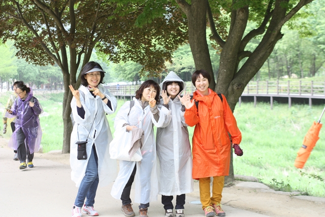 아침 9시 10분, 스님이 문경새재 입구에 도착하니 비옷이나 우산을 쓰고 즐겁게 걸어가는 통일특위 회원들을 만날 수 있었습니다.