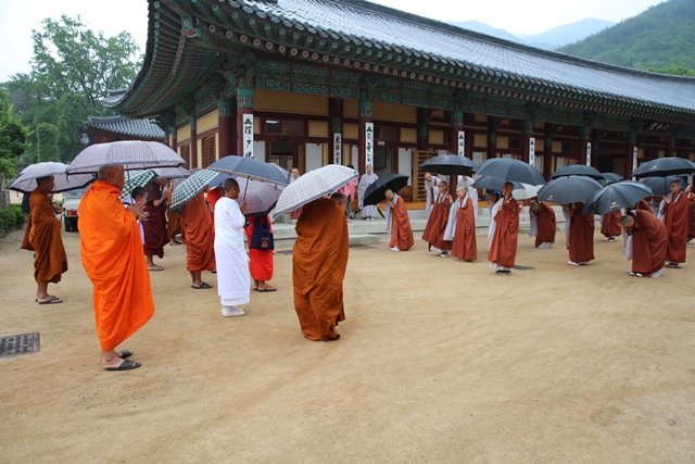 운문사에 도착하니 우산을 써야 할 정도로 비가 내리고 있었습니다. 스님은 “이곳은 현재 비구니 사찰입니다. 비구니가 되는 승가대학이 이 안에 있습니다. 현재는 방학 중이라 스님들이 많이 계시지는 않는다고 해요.”라고 설명하며 우산을 펼쳐들고 INEB 동남아 스님 방문단과 운문사 경내로 차분히 들어갔습니다.