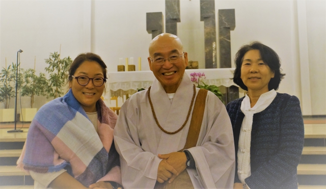 스님은 대기실에서 기다리고 있다 큰 박수소리와 함께 연단으로 나갔습니다. 먼저 예수님께 반배로 인사하고 청중에게 인사하였습니다.