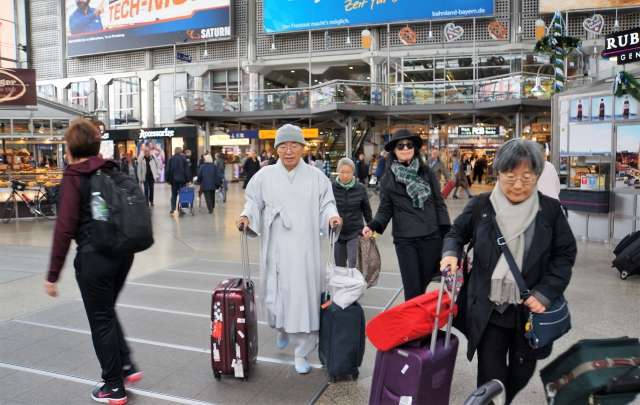 뮌헨 부총무 신봉철님이 출근길에 스님 배웅을 위해 역으로 인사하러 왔습니다. 정토회에서는 흔치 않은 남성 부총무님이 새롭게 전법에 힘쓰는 모습이 참 고맙게 느껴졌습니다. 시간이 다 되어 플랫폼으로 이동하려는데 독일을 여행중인 한국인 여성 두 명이 다가와서 스님과 꼭 사진을 찍고 싶다고 해 스님은 흔쾌히 사진 촬영에 응해주었습니다.