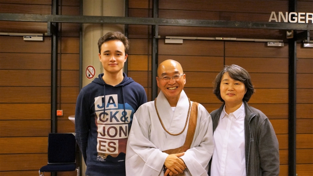 이어 오늘 강연을 총괄한 뒤셀도르프 부총무 최순진님과 자원봉사를 한 아드님이 스님과 함께 사진촬영을 하였습니다. 최순진님은 오늘 불교대학 졸업식과 수계식도 진행스탭으로 함께 하여 오늘 스탭 중 가장 바빴던 분이 아니었나 싶습니다. 그럼에도 미소를 잃지 않고 봉사자들을 챙겨가며 일하는 모습이 늘 감동적입니다.
