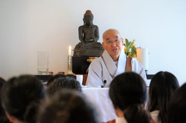 “지난 1년 동안 불교대학 다닌다고 수고 많이 했습니다. 무사히 과정을 마치고 졸업하게 된 것을 진심으로 축하합니다. 불교대학 교과과정을 살펴보면 크게 4과목입니다. 불교의 첫걸음, 부처님의 일생, 근본가르침, 불교의 역사로 편성되어 있습니다. 첫 번째 과목에서 가장 중요한 것은 ‘불교란 무엇인가?’ 입니다. ‘다른 종교, 다른 철학과 어떤 차이가 있는가? 왜 내가 불교를 선택하는가?’ 하는 가장 근원적인 물음에 대해 공부합니다. 세상에는 크게 나누어 종교와 철학이 있습니다. 종교는 믿음, 철학은 이치를 중심으로 하는 것입니다. 따라서 종교는 감성적이고, 철학은 이성적이다 말할 수 있습니다. 불교는 종교형식을 가지고 있으나 철학적 관점을 더 많이 가지고 있습니다. 그래서 기독교에서는 불교를 종교라기보다는 철학처럼 보는 것 같습니다. 원래 불교는 종교나 철학과는 근본적으로 다릅니다. 불교는 종교와 철학과는 다른 제 3의 길, 수행이라는 것을 자기의 정체성으로 삼습니다. 가장 중요한 것은 ‘불교의 본래 가르침이 무엇인가?’ 라는 정체성을 확보하는 것입니다. 불교는 깨달음의 가르침이고, 무지를 깨우쳐 고뇌로부터 벗어나는 가르침입니다.