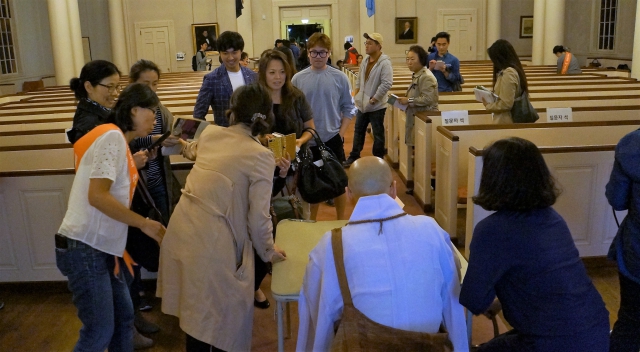오후 3시부터 Yenching Auditorium 에서 제이슨 림의 영어통역으로 즉문즉설 강연이 진행되었습니다. 강연이 시작하길 기다리며 자리에서 책이나 수업 자료를 들고와서 읽고 있는 학생들이 많았습니다. 스님은 10년 전에 하버드대학교에서 북한문제 및 한반도 관련 주제로 즉문즉설을 한 적이 있습니다. 그리고 한국인을 대상으로 즉문즉설 강연을 몇 차례 하기도 하였습니다. 그러나 외국인을 대상으로 한 통역 즉문즉설 강연은 이번이 처음이었습니다.