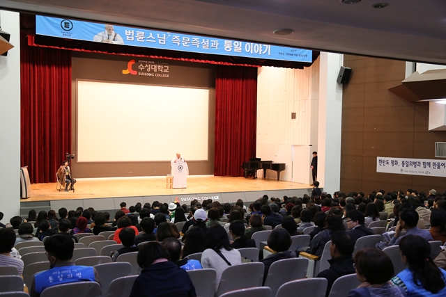 강연이 열린 대구는 하늘이 높고 푸른 전형적인 가을 날씨였습니다. 수성대 캠퍼스는 짙어가는 단풍을 만끽하려는 대학생이 삼삼오오 짝을 지어 벤치에서 커피도 마시면서 담소를 나누는 모습들이 참 평화로워 보였습니다. ‘그 평화가 깨지진 말아야 할 텐데’ 하는 마음으로 즉문즉설과 통일 이야기가 진행될 장소로 발걸음을 향했습니다.