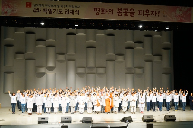 2, 3월에는 많은 사람들이 불교대학, 행복학교를 다닐 수 있도록 인연 맺어주는 일부터 하고, 4월이 되면 평화운동에 우리가 힘을 쏟아야 되겠습니다. 이것이 ‘제9차 천일결사 제4차 백일기도’의 실천과제입니다. 이 과제에 적극적으로 참여해 주시기 바랍니다. 함께 하시겠습니까?”