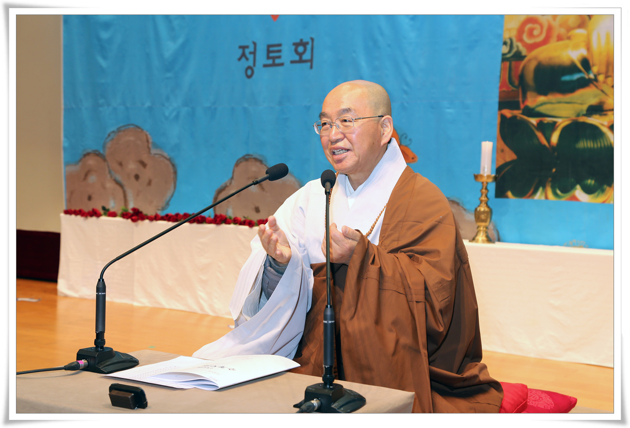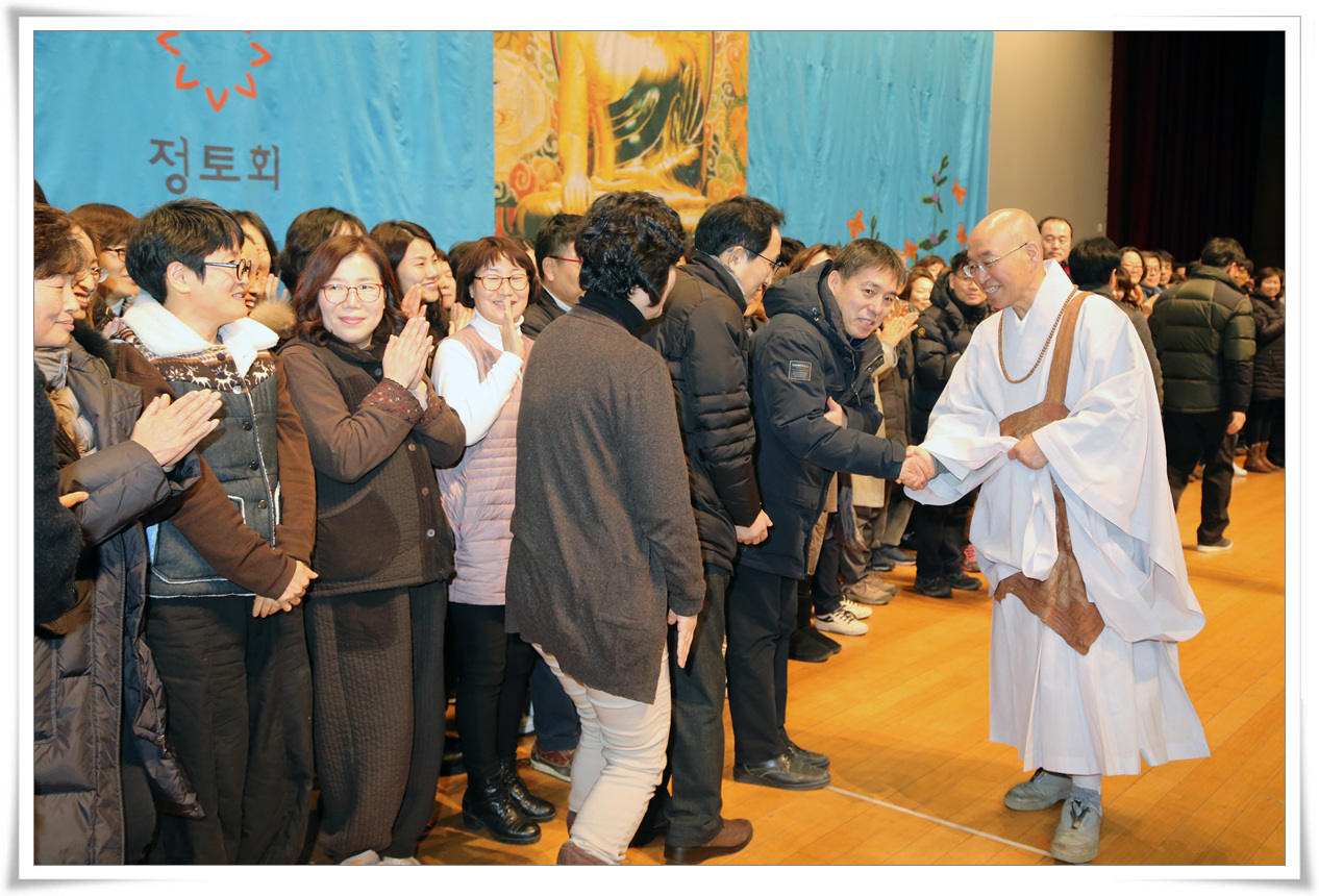 “여러분들이 과거에 불교 신자였든, 기독교 신자였든, 무슨 신자였든 지금까지는 복을 구하는 신자였을지 몰라도 오늘부터는 ‘수행자’입니다. 그래서 누구에게 의지하는 게 아니라 의지처가 되어주는 사람, 누구로부터 이해를 받으려고 하는 게 아니라 남을 이해해주는 사람, 남에게 도움을 받는 게 아니라 도움을 주는 사람, 남의 사랑을 구걸하는 게 아니라 내가 사랑을 주는 사람이 되겠다고 삶의 자세를 확 한 번 뒤집어야 합니다. 뒤집었어요?”