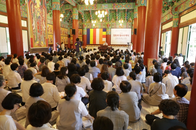 대중들이 큰 박수로 감사의 마음을 전하자 불심 도문 큰스님은 법상에 올라오셔서 수계자들이 부처님의 삶을 닮아가려면 어떻게 해야 하는지 설법을 해주셨습니다.