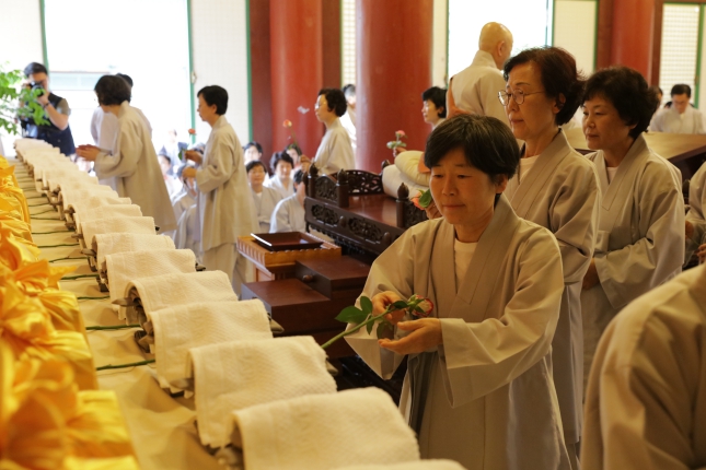 이어서 신규법사님들이 불단 앞으로 나와서 수계를 받은 기쁨과 감사의 마음을 모아 부처님께 꽃 공양을 올렸습니다.