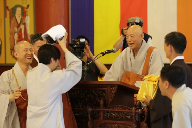 저의 스승님이신 불심도문 큰스님께서 연세도 많으신데 노구를 이끄시고 저희들 26명을 위해 몇 날 몇 일 잠을 못 주무시고 직접 법명도 다 지어주시고 준비를 해주셨습니다. 용성조사님을 비롯한 역대 조사님들이 지켜보는 가운데 오늘 우리가 그 법을 이어가는 거룩한 수계식을 큰스님 모시고 한 것에 대해 큰 영광으로 생각합니다. 큰스님께 큰 박수 부탁드립니다.”