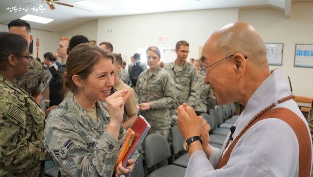 오늘 강연장은 마치 콘서트장처럼 분위기가 좋았습니다. 어제 담마 범 템플과 오늘 국방부 언어학교처럼 젊은 층들의 가볍고 밝은 분위기가 스님의 웃음 코드와 맞아떨어지니 강연장에 큰 웃음이 터지고 아주 즐거운 시간이 되었습니다. 젊은 사병들이라서 그런지 스님과 호흡이 아주 잘 맞아떨어지는 것 같았습니다. 지난번 SBS 프로그램 ‘집사부 일체’에서도 스님과 청년들 간의 호흡을 여과 없이 볼 수 있었는데 미국에서도 그런 모습을 그대로 볼 수 있었습니다. 또한 한반도 관련 답변에서는 스님의 지혜가 빛을 발해 모두들 큰 박수로 화답했습니다.