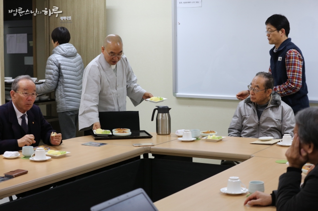 스님은 구치소에 있는 지인을 면회하기 위해서 다른 분들보다 조금 일찍 회의실을 나왔습니다. 오후에는 감기 몸살기가 심해 병원을 다녀온 후 기획위원장으로부터 평화재단 활동방향에 대한 보고를 받고, 오늘 강의를 해 주실 이영탁 전 교육부 차관님과 저녁 식사를 하며 미래사회에 대비한 교육 현실에 대한 의견을 나누었습니다.