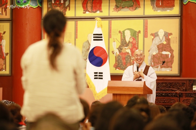 “지금까지 법문 듣고 좀 깨달은 게 없어요? 무슨 기도문을 또 줘야 돼요? 300배 절하라고 해야 문제가 풀리겠어요? 상대의 행동이나 말을 보고 순간적으로 기분이 나쁘면 ‘아, 내가 그렇게 느끼는구나’ 이렇게 알아차리는 게 중요하지, 절하는 게 중요한 게 아니에요. 이걸 영 못하면 스님이 벌로 절을 시키긴 해요.(모두 웃음)