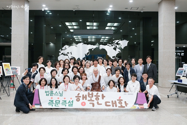 “불교계의 BTS이신 스님을 모시게 되어 영광입니다. 더구나 귀한 강연이 공짜라니 더욱 놀랍습니다. 그래서 스님께 이 빚을 어떻게 갚아야 하냐고 여쭤보니 행복하면 된다고 하셨습니다. 오늘 시민 여러분도 모두 법륜 스님 강의 듣고 행복하시길 바랍니다.”