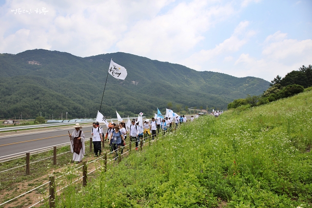 “정토 연수원은 둔덕산 아래에 위치하고 있어요. 이 둔덕산과 그 옆에 대야산 사이로 계곡이 흐르는데 이 계곡이 용추계곡입니다. 아름다운 용추계곡을 산책하면 좋은데, 여러분들이 깃발을 들고 가는 재미를 느껴야 한다고 해서 용추계곡은 못 보고 저 아래쪽으로 지금 걸어가고 있어요.