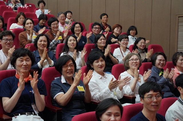 수행하고 봉사하면서 남편과 다툼이 많이 줄었습니다. 법당 일이 바쁘다 보니 사소한 것에 목숨 걸고 싸울 틈이 없습니다.(모두 웃음) 법당 일로 바쁜 저를 보고 남편이 왜 사서 고생을 하냐고 물으면 가정만 돌보기에는 내 그릇이 너무 큰 것 같다고 자뻑하기도 합니다. (모두 웃음, 박수) 남편을 원망했었는데 이제는 저를 여기까지 인도한 남편이 바로 관세음보살의 화현이라고 생각합니다. 지금 저는 누구보다 행복합니다.”(모두 박수)