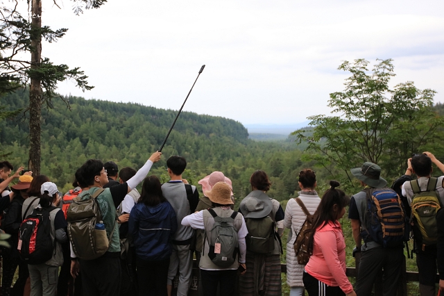 “여기가 지하삼림입니다. 계곡의 주변 지반이 붕괴하여 생긴 거대한 웅덩이 같은 곳에 형성된 울창한 숲이에요. 지하에 숲이 있는 것이 아니라 계곡이 함몰된 곳에 숲이 형성된 것인데, 여기 절벽에서 보면 마치 땅 아래에 숲이 있는 것 같죠. 땅이 푹 꺼진 곳에서 나무들이 자라고 있어서 지하삼림이라고 해요. 김홍신 작가님이 소설 ‘대발해’를 상당 부분 써놓고 나서 역사기행을 왔었는데, 여기서 이 지하산림을 보고 발해 군사들이 여기 지하산림에서 훈련하는 내용을 덧붙였다고 해요.”