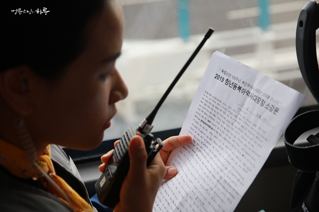 다시 버스를 탔습니다. 단잠도 자고, 몸도 푸니 한결 개운합니다. 버스 안에서는 어제 작성한 소감문을 발표하고 나누는 시간을 가졌습니다. 1호차, 2호차, 3호차, 차량 별로 한 명씩 돌아가며 송신기를 통해 소감문을 읽어 내려갔습니다.