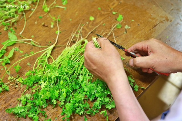 한바탕 웃음꽃을 피우며 오늘 딴 고소를 모두 손질했습니다. 깨끗하게 씻은 고소는 통에 담아 냉장고에 보관했습니다.