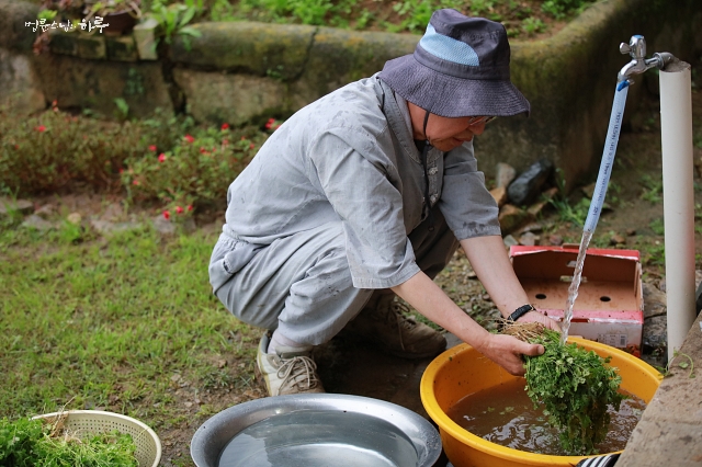 젊은 행자님이 삽질을 신나게 하는 사이 스님은 방금 뽑은 고소를 물에 씻었습니다.