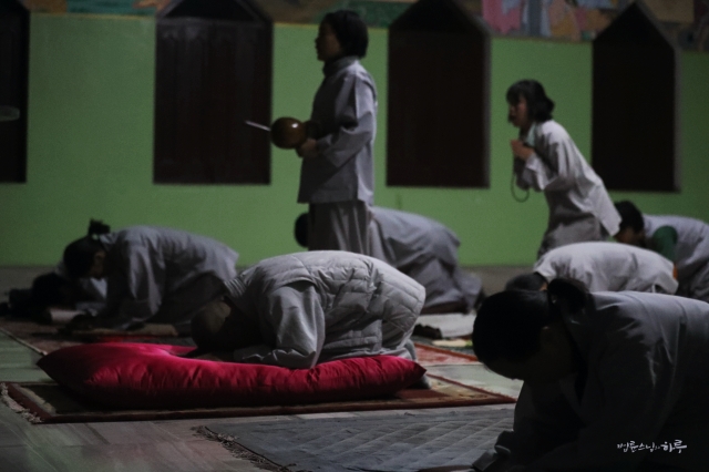 새벽 5시, 법당에서 예불과 천일결사 기도를 하며 하루를 시작했습니다.