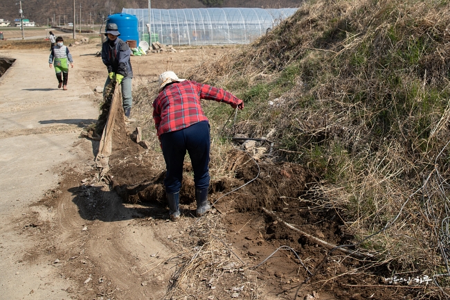 비닐하우스, 밭, 논으로 이어지는 수로에 물이 잘 빠지는지 점검하고, 뒷산에서 내려오는 물이 잘 빠지도록 수로를 더 파야할 곳도 확인했습니다. 논둑이 무너져 물이 잘 빠지지 않는 곳은 돌로 축대를 쌓고 물길을 만들어 주기로 했습니다.