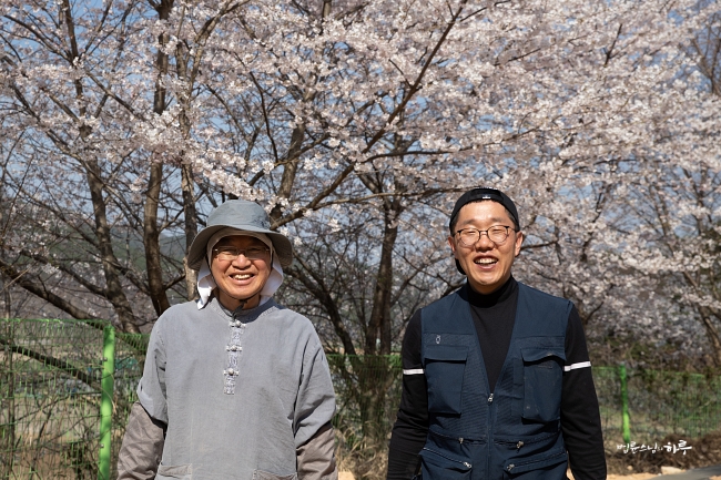 점심시간에는 김제동 씨가 찾아왔습니다. 김제동 씨는 내일 코로나 바이러스로 고생하는 대구의 간호사들을 위로하기 위해 위문품을 가지고 대구로 가기로 했는데, 대구에 먼저 갔다가 오면 스님에게 위험할까봐 먼저 와서 하루를 같이 보내고 내일 오후에 간호사들을 위문하러 간다고 합니다. 함께 식사를 하고 오후부터 농사일을 함께 했습니다. 벚꽃으로 둘러싸인 밭에 농사 도구를 챙겨 올라갔습니다.