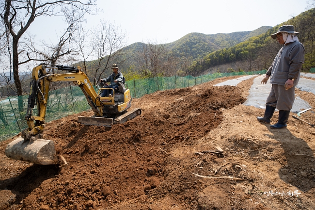 스님은 포클레인을 지휘하는 감독이 되어 어느 땅을 파서, 어디로 흙을 붓고, 어떻게 평탄화 작업을 할지, 하나하나 지휘하며 조금씩 밭을 만들어 나갔습니다.