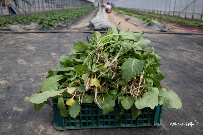 비닐하우스 전체를 둘러보니 열무가 수북하게 잘 자라 있었습니다.