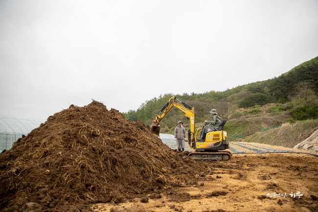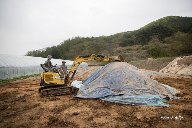 “마지막에 포클레인 삽으로 비닐 덮어 놓은 꼭대기를 꾹 눌러 놓으세요.”