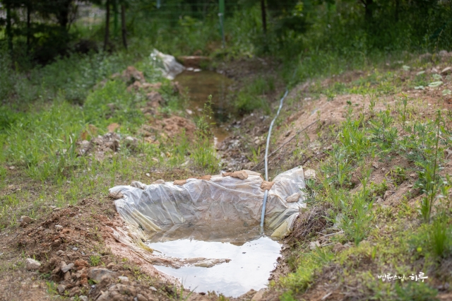 스님이 파놓은 연못의 물을 전기를 사용해 물통으로 옮길 수 있는지 전기선을 연결해보았습니다.