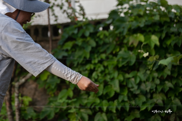 “여기는 새로 지은 비닐하우스예요. 처음에는 노지 재배를 하려고 작물을 다 심어 놓았는데, 군에서 뒤늦게 비닐하우스 짓는 것이 허가 나는 바람에 작물을 먼저 심고 나서 그 위에 비닐하우스를 지었어요.
