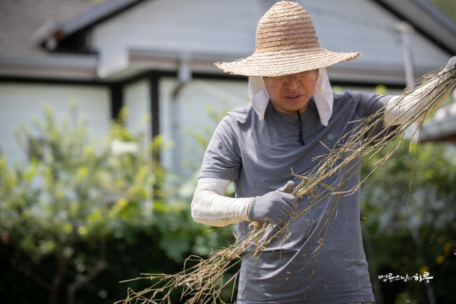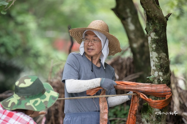 스님은 행자 한 명에게 고수 씨앗을 터는 법을 알려준 후 말린 대나무 가지를 가져왔습니다. 비가 와서 며칠 째 대나무 빗자루를 못 만들었는데 어제부터 해가 나서 드디어 작업을 하게 되었습니다.