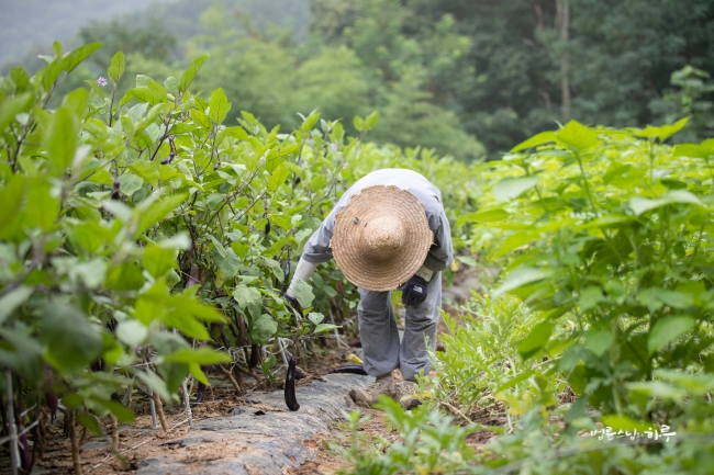 한참 풀을 베다 일을 마쳤습니다. 수확물을 들고 밭을 내려왔습니다.