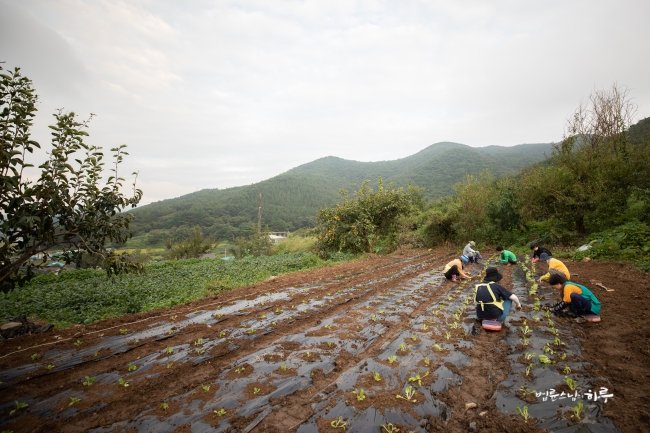 함께 하니 금세 다섯 두둑에 배추를 다 심었습니다.