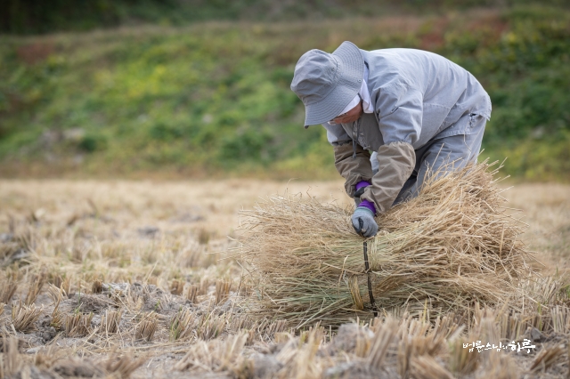 점심을 먹고 나서 오후에는 다 같이 추수가 끝난 논으로 가서 볏짚을 묶는 울력을 했습니다.
