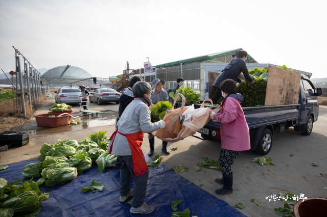 밭 뒤편에서는 영남권 정토행자들에게 나누어줄 배추를 싣고 있었습니다.