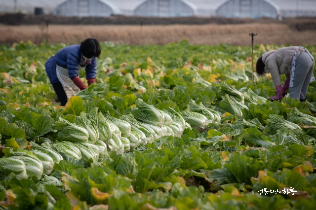 오늘은 다 자란 배추를 수확하기 위해 농장에 왔습니다. 십여 명의 봉사자가 함께 울력을 했습니다.