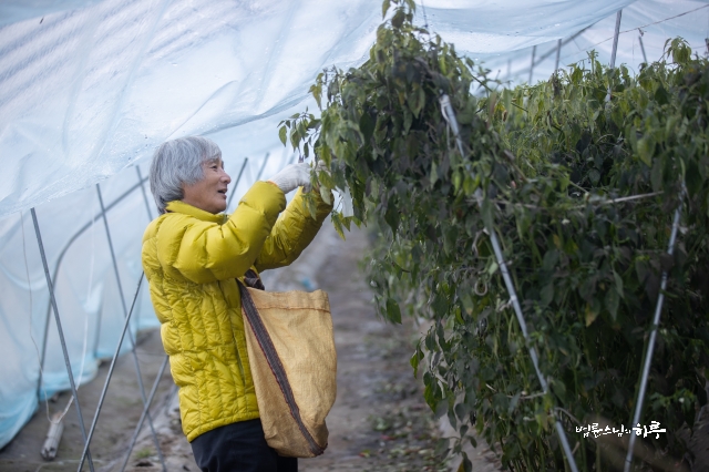 “작년에 고추 농사를 지어보니까 첫 추위만 잘 넘기면 12월까지는 겨울에도 계속 고추를 수확할 수 있겠다고 생각해서 이중 비닐을 치고 고춧대를 남겨 두었어요. 그런데 올해는 추위가 계속되어서 결국 정리를 하려고 합니다. 또 이중 비닐을 해놓으니까 안에 습기가 차서 곰팡이까지 생긴 것 같아요. 그래서 고추가 빨갛게 익지는 않았지만 다 따려고 합니다. 빨간 물이 든 것은 전부 다 따주세요.”