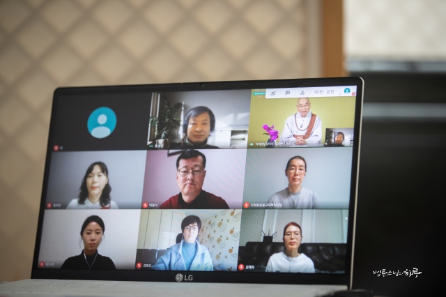 입재법문을 마치고 학생들은 화상으로 조별 나누기 시간을 가졌습니다. ‘불교대학 1년을 통해 깨달은 점과 변화된 점’, ‘나의 수행과제’를 나누고 스님의 하루 발췌문을 함께 읽었습니다.