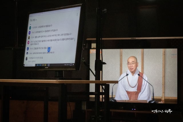 잠시 휴식한 후 오후 3시부터는 온라인 정토불교대학 학생들을 위한 즉문즉설을 시작했습니다. 그동안 온라인 불교대학 학생들은 실천적 불교사상, 부처님의 일생, 근본불교, 세 과목에 대한 학습을 마쳤습니다. 오늘은 근본불교 과목을 공부하면서 궁금한 점을 해소하기 위해 마련된 시간입니다.