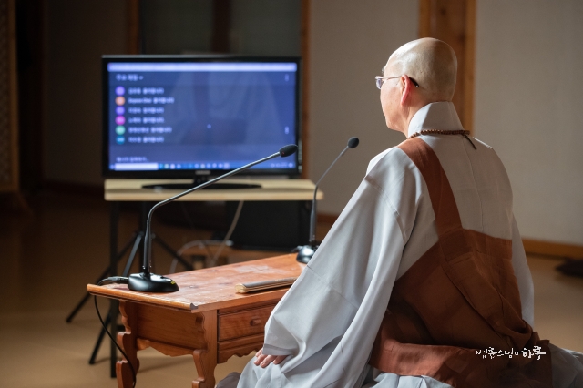 그동안 경전반 학생들은 금강경, 반야심경, 법성게, 육조단경 학습을 마쳤습니다. 오늘은 육조단경과 신심명을 공부하면서 궁금한 점을 해소하기 위해 마련된 시간입니다. 1,300여 명의 경전반 학생들이 생방송에 접속한 가운데 스님이 웃으며 인사를 건넸습니다.