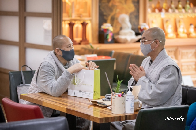 “아이고, 스님께서 직접 갖고 오셨네요. 잘 먹겠습니다.”