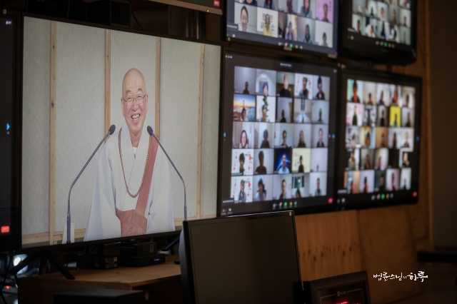 참가자들은 하루 종일 명상을 한 후 저녁 7시 20분에 스님과 즉문즉설을 하기 위해 화상회의 방에 입장했습니다. 서로의 얼굴을 보지 못하고 혼자 방에서 명상을 하다가 처음으로 화면을 통해 서로 얼굴을 마주했습니다.