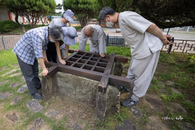아도모례원 앞에는 신라에 처음 불교를 전한 아도 화상이 머물렀다는 모례 장자의 집에 있던 우물이 아직까지 남아 있었습니다. 우물 앞에서 스님은 신라에 불교가 어떻게 처음 전해졌는지 들려주었습니다.
