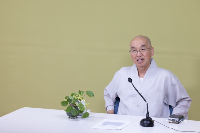 500여 명이 화상회의 방에 입장하고, 1000여 명이 생방송에 접속한 가운데 스님이 인사말을 건넸습니다. 스님의 책상 앞에 놓인 화병에는 세 번째로 꽃이 바뀌었습니다.