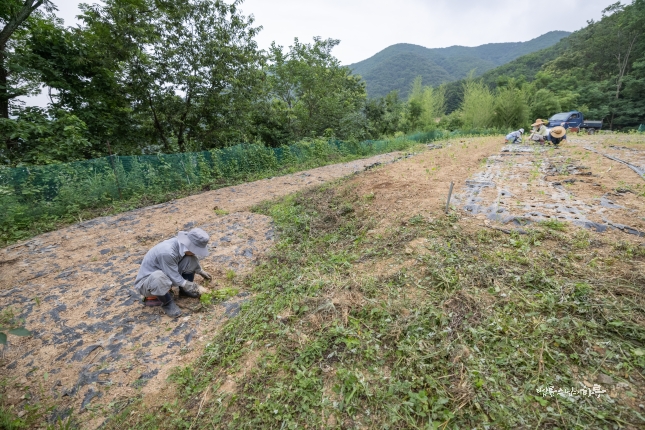 들깨 모종을 심는 동안 두 명은 예초기를 돌렸습니다.