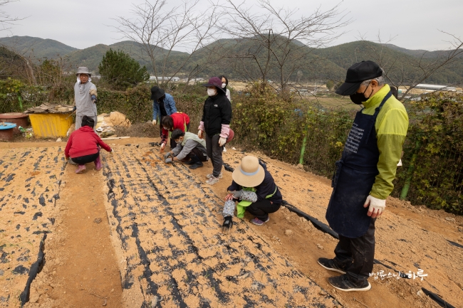 주말을 이용해 봉사자들이 많이 와서 겨울 채소를 심고 있었습니다. 강연을 하다가 온 스님도 뒤늦게 합류해서 함께 일을 했습니다. 채소 심기를 다 마치고 봉사자들과 기념사진을 찍은 후 산 윗 밭으로 올라갔습니다.